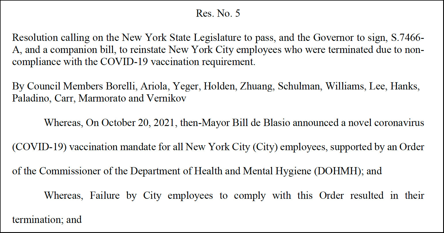Resolution 5 calls on the New York State legislature to pass, and the governor to sign, S.7466-A and a companion bill to reinstate NYC employees who lost their jobs under the City’s COVID-19 vaccine mandates.